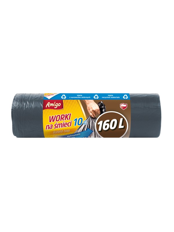 Worki marki Amigo mają pojemność aż 160L i cechuje je wyjątkowa wytrzymałość i szczelność. To idealne worki na odpady zmieszane, pozwalają dbać o to, aby nieprzyjemne zapachy nie wydostały się na zewnątrz. Doskonale pasują na standardowy stojak na worki na śmieci lub kubeł 120L!