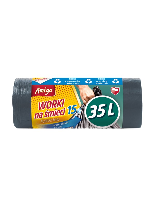 Czy znasz już nasze worki 35L pochodzące w 100% z recyklingu? Jeśli nie, koniecznie wypróbuj worki na śmieci Amigo! Są wykonane z bardzo elastycznego i wytrzymałego materiału LDPE, więc doskonale nadają się do kosza w domu lub w biurze. Na jednej rolce znajduje się 15 sztuk worków 35L