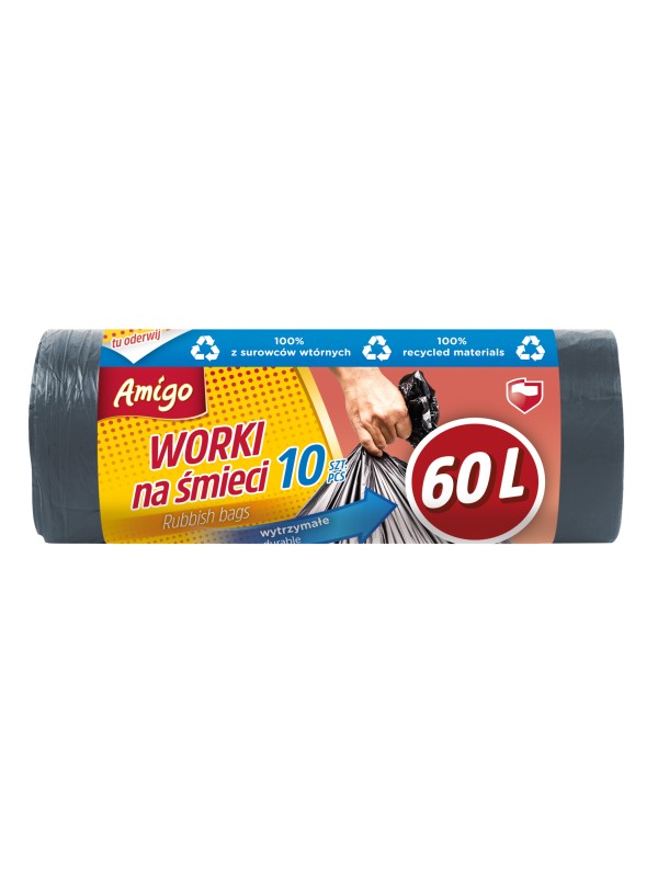 Każda rolka zawiera 10 worków w 100% wykonanych z surowców wtórnych! Jeśli szukasz trochę mniejszych worków, wypróbuj worki 35L marki Amigo!