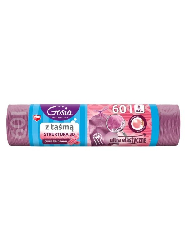 Gosia worki z taśmą ultraelastyczne struktura 3D Guma Balonowa 60L to idealne rozwiązanie do większych pojemników o pojemności do 60 litrów! Stworzone z myślą o wymagających użytkownikach, którzy oczekują nie tylko trwałości, ale też dodatkowej świeżości w swoim otoczeniu.