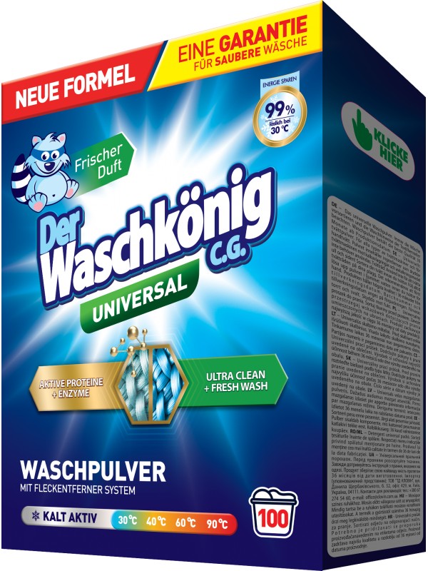 Proszek do prania Der Waschkönig C.G. Universal 6 kg to synonim niemieckiej jakości i efektywności w pielęgnacji tkanin. Formuła bez fosforanów i zeolitów jest delikatna dla skóry, a zawarte środki przeciw kamieniowi zabezpieczają pralkę.